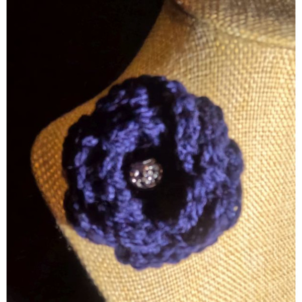 This lovely navy blue flower brooch has been crocheted using acrylic yarn. It is embellished by a pretty metal bead in the flower centre.