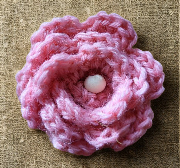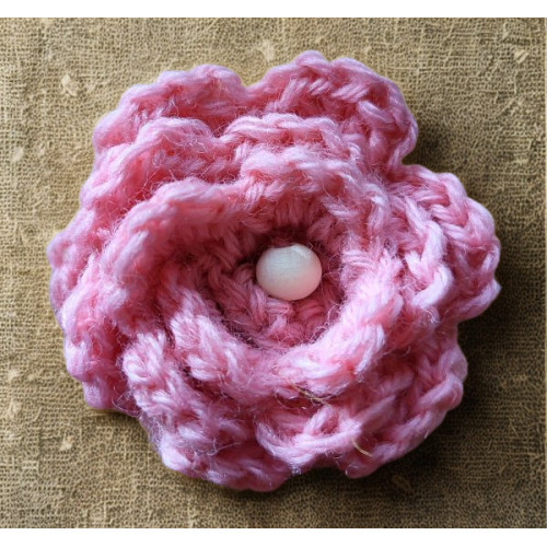 This lovely flower brooch has been crocheted using pink acrylic yarn. It is embellished by a pretty wooden bead in the flower centre.