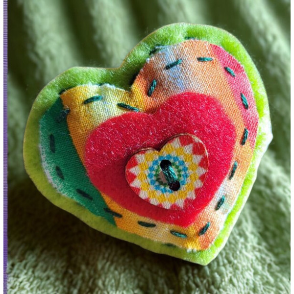 This heart shaped brooch embellishment is perfect for dressing up an outfit, hat, scarf or bag. It has been handcrafted using lime green felt, red felt and rainbow fabric with a heart-shaped button. It fastens with a brooch pin sewn onto the back.