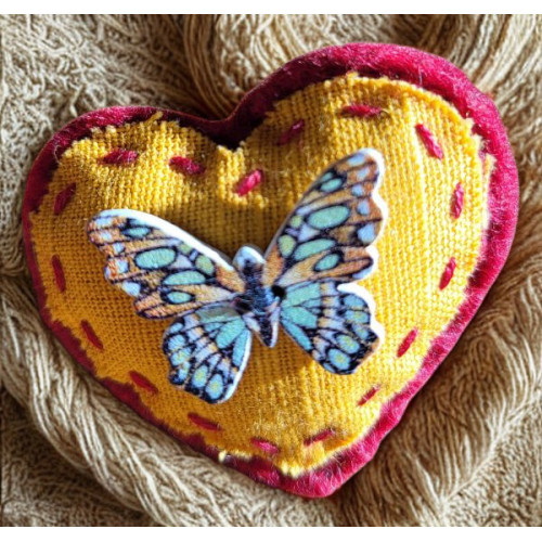 This heart shaped brooch embellishment is perfect for dressing up an outfit, hat, scarf or bag. It has been handcrafted using red felt and yellow fabric with a butterfly-shaped button. It fastens with a brooch pin sewn onto the back.
