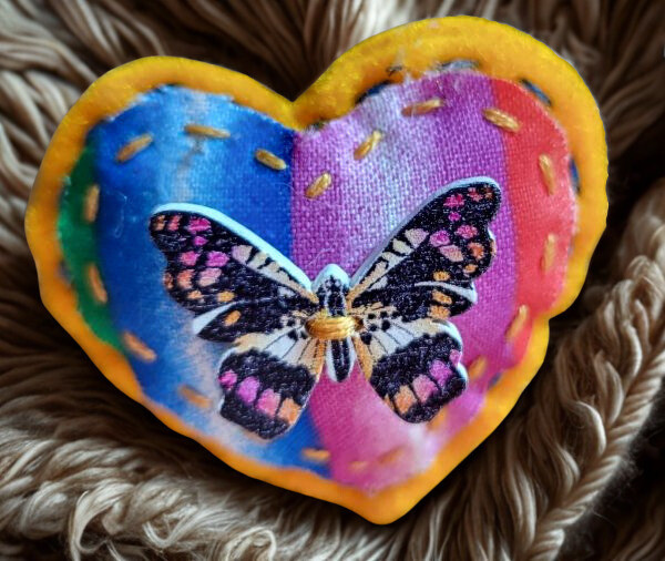 This heart shaped brooch embellishment is perfect for dressing up an outfit, hat, scarf or bag. It has been handcrafted using yellow felt and rainbow fabric with a butterfly-shaped button. It fastens with a brooch pin sewn onto the back.