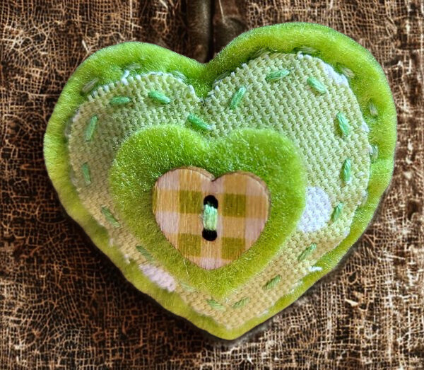 This heart shaped brooch embellishment is perfect for dressing up an outfit, hat, scarf or bag. It has been handcrafted using lime green felt and pale green fabric with a heart-shaped button. It fastens with a brooch pin sewn onto the back.