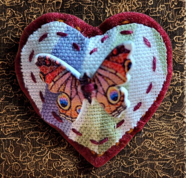 This heart shaped brooch embellishment is perfect for dressing up an outfit, hat, scarf or bag. It has been handcrafted using red felt and floral fabric with a butterfly-shaped button. It fastens with a brooch pin sewn onto the back.