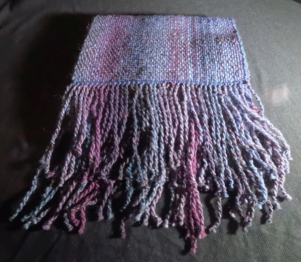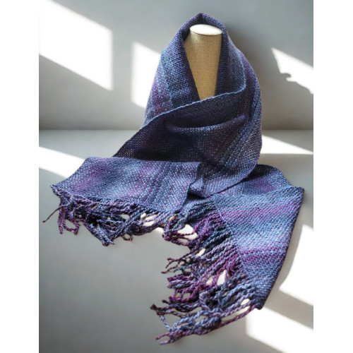This scarf has been woven on a rigid heddle loom using acrylic double knitting yarn. The colour of this scarf is varying shades of purple.