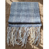 This scarf has been woven on a rigid heddle loom using acrylic double knitting yarn in a denim shade of blue with cream accents throughout.