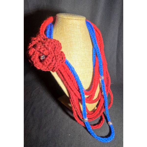 This neck warmer is created using burgundy, red and royal blue acrylic yarn.