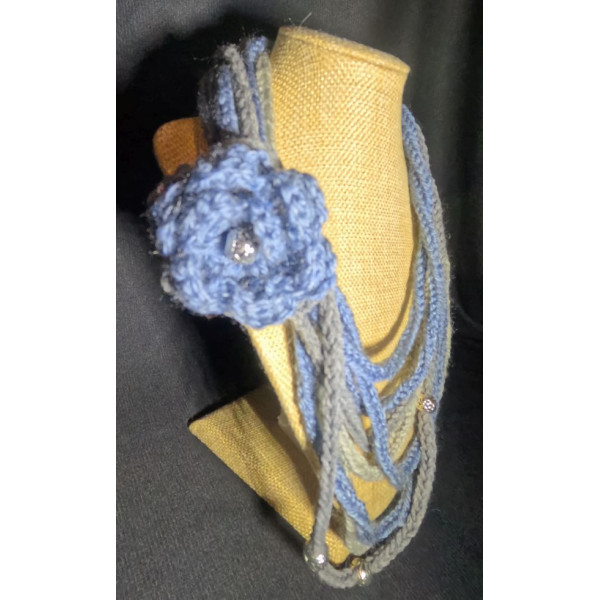 It is woven using a lucet tool and then embellished with a crocheted flower brooch. The brooch is detachable so you can switch it up with your style, depending on your mood or to colour coordinate with your outfit. Additional brooches can be found in the brooches section of this website, or you can feel free to add your own. You can also wear it without any brooch attached if that works best for you.
