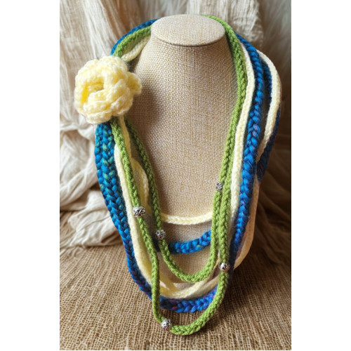 It is woven using a lucet tool and then embellished with a crocheted flower brooch. The brooch is detachable so you can switch it up with your style, depending on your mood or to colour coordinate with your outfit. Additional brooches can be found in the brooches section of this website, or you can feel free to add your own. You can also wear it without any brooch attached if that works best for you.