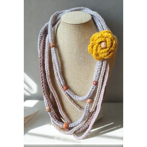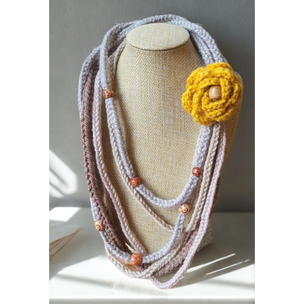 It is woven using a lucet tool and then embellished with a crocheted flower brooch. The brooch is detachable so you can switch it up with your style, depending on your mood or to colour coordinate with your outfit. Additional brooches can be found in the brooches section of this website, or you can feel free to add your own. You can also wear it without any brooch attached if that works best for you.
