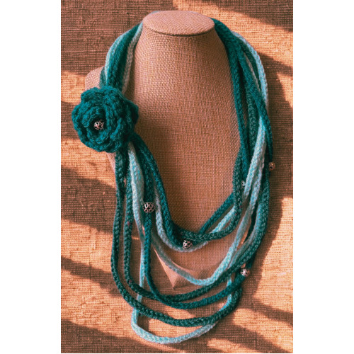 It is woven using a lucet tool and then embellished with a crocheted flower brooch. The brooch is detachable so you can switch it up with your style, depending on your mood or to colour coordinate with your outfit. Additional brooches can be found in the brooches section of this website, or you can feel free to add your own. You can also wear it without any brooch attached if that works best for you.