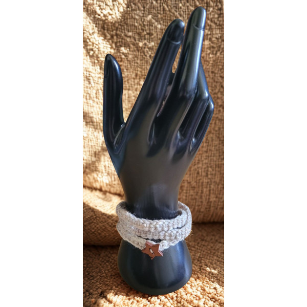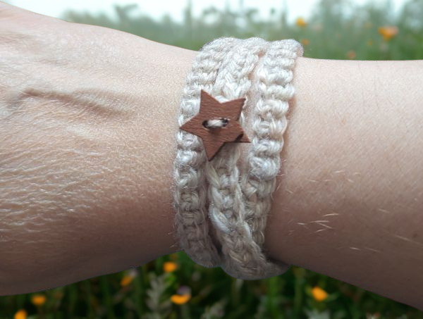 This wrist band has been created using the Traditional Crochet method to form a long band that wraps around the wrist. It fastens with a decorative wooden, star-shaped button that goes through a buttonhole.