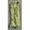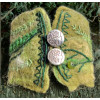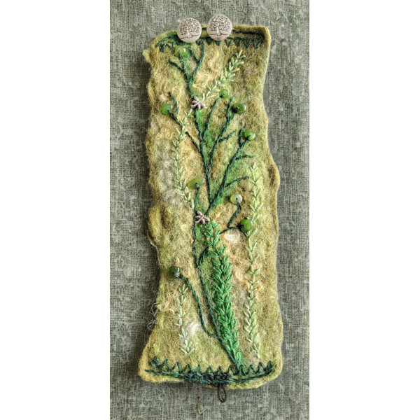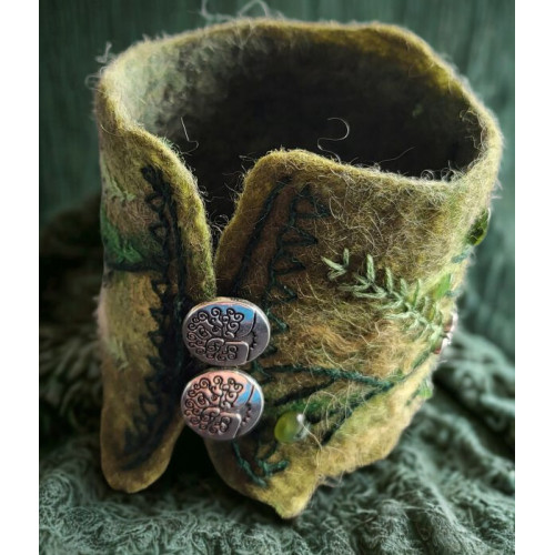 This wristband has been created by wet felting wool into a rectangular wrap-around. It fastens with 2 metal buttons with a tree design attaching to elastic loops. It is decorated with hand embroidery, metal charm embellishments and nephrite jade crystals.