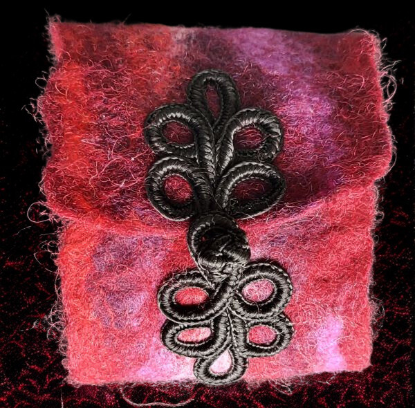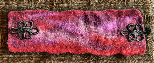 This wristband has been created by wet felting red and purple wool fleece into a rectangular wrap-around. It fastens with a black frog fastener.