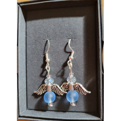 These earrings are created using beads and metal wings to resemble an angel. They measure approx 2.5cm x 2.5cm. The total hanging length of the earring is 4.5cm.