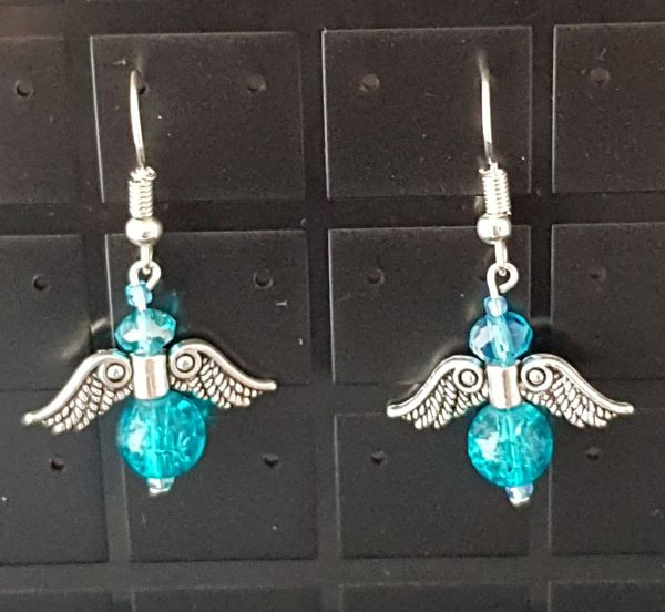 These earrings are created using beads and metal wings to resemble an angel. They measure approx 2.5cm x 2.5cm. The total hanging length of the earring is 4.5cm.