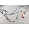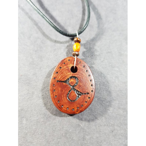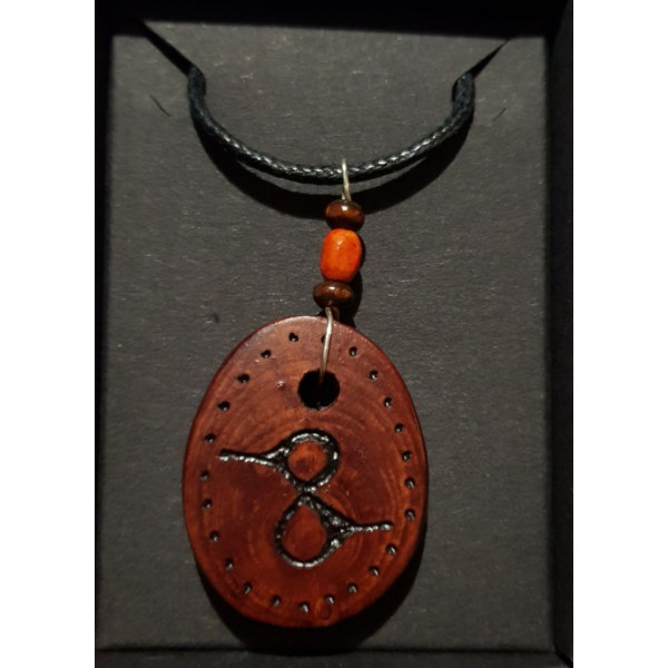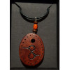 The wooden carved piece is attached to a long thong by wire and is finished with 3 small wooden beads. The thong is adjustable to allow the necklace to be placed over the head easily and then shortened to the desired length.