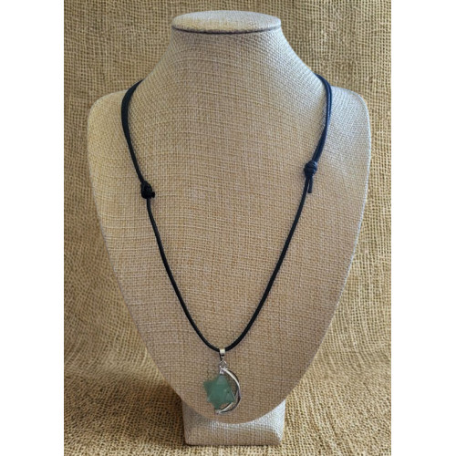 This necklace has a green aventurine crystal star that spins on a metal framework. It is hung from a waxed cotton cord that adjusts in size to alter the length by sliding the knots until the desired length is reached.