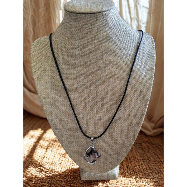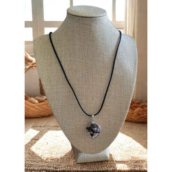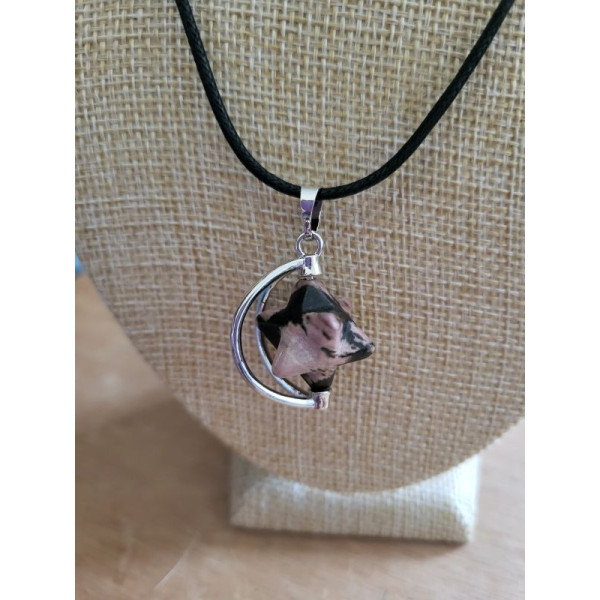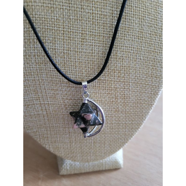 This necklace has a rhodonite crystal star that spins on a metal framework. It is hung from a waxed cotton cord that adjusts in size to alter the length by sliding the knots until the desired length is reached.